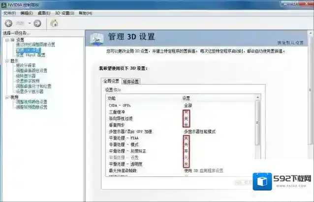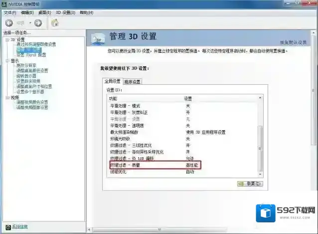 在管理3d设置中将小编标出来的功能关闭,然后把纹理调到高性能模式