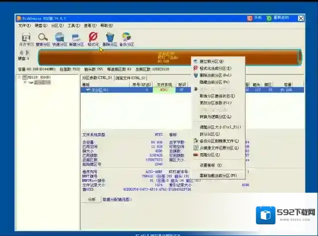 3、首先使用pe系统内的diskgen进行分区,这里小编建议一个分区就好,这里的分区是将之前安装虚拟机时的60g虚拟硬盘进行分区,对win7系统的硬盘没有任何影响,请大家放心分区