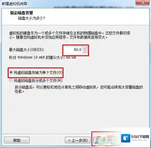 8、因为win10所需的内存空间比较大,这里我们一般选择位50到60GB