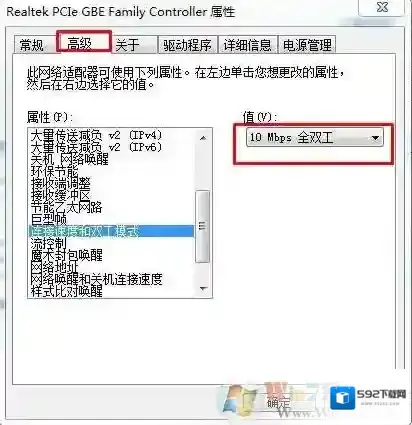 5、点击高级,然后在属性中选择,连接速度和双工模式,把值设置为10M全双工;