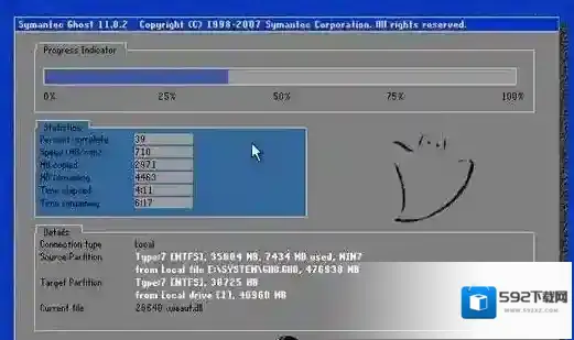 4、重启后,一般我们都不用选择会自动进入GHOST界面,这时文件会解压到C盘,安装进度条完成后会重启;