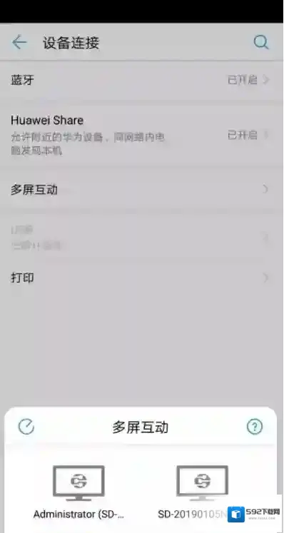 1. 在手机上打开设备连接 多屏互动,然后搜索设备。(以下是华为手机,如果是其他手机普遍是在“更多连接”那里)