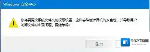 8.点击后,系统提示你将要更改系统文件夹的权限设置,这样会降低计算机的安全性,并导致用户访问文件时出现问题。要继续吗?我们点击是。如下图所示。
