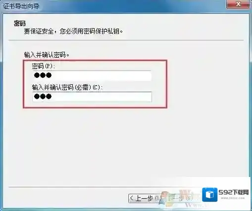10、此时会弹出“证书导出向导”,输入并确认密码,接着点击“下一步”;