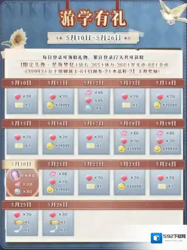 每日前往活动面板均可领取礼物,累计登录17天可领取限定头像·星海梦忆及钻石*365+体力*366+星光币*88+金币*139993+公主级刷新卡*6+幻阁券*2+水晶鞋*2奖励!