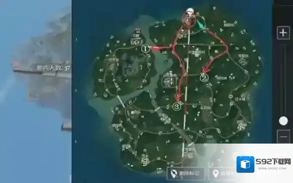 如果安全区朝中心或东或南刷, 那么我们就可以直接选择②号线,注意线路,要尽可能规避天堂度假村这个热点。这个时候很多提前跑出来的或是已经搜完该区域的玩家,遇到了就免不了要打劫,所以尽可能规避。