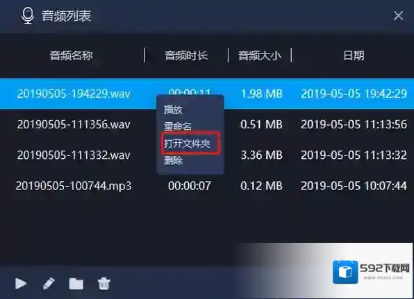 5、点击齿轮旁边的“正方形”图标,即“音频列表”,选中音频并右击鼠标,选择打开文件夹,然后跳转到录音文件的电脑保存位置。