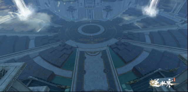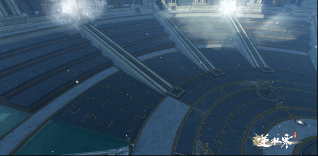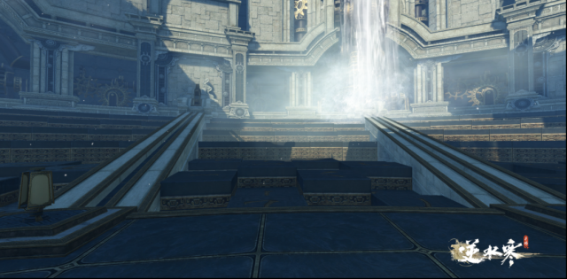 游戏开发过程中画面,非最终效果图气势恢宏的庭台前,如琥珀般澄净的湖水倒映着云影与雪山,平静湖水的深处,深藏着机关发明的奥秘。