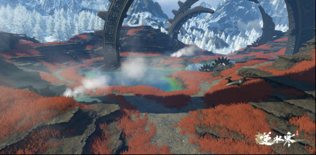 游戏开发过程中画面,非最终效果图冰雪之间,泉水如沸,冰火交融,汹涌不息。这里,有着机关之城得以运转的秘密。