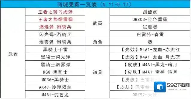 不止这些,还有固定弹道霰弹枪KSG–黑骑士、挑战强化MG36–黑骑士、开火极稳的生化步枪M4A1–变色龙、点扫兼备的AK47–沙漠领主、生化巨斧弑魔者、经典神兵剑齿虎、软萌可爱的QBZ03–金色蔷薇、表情鬼才葵等臻品道具。下面是商城更新一览表,CFer们可在琳琅满目的道具中随心挑选: