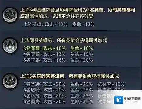 当我方英雄阵营克制目标时,将会提高暴击、触发强击以及提升伤害,反之,若被克制时,将会减少暴击、触发弱击以及降低伤害。