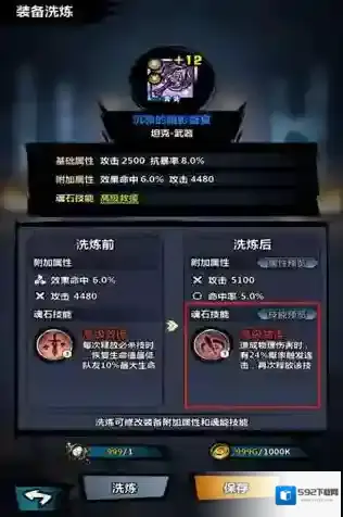 3、如果对获取的装备技能不满意,可以使用洗练功能对装备技能进行重置,重置范围固定在装备原来给出6个初始技能之间随机选择,洗练需要消耗洗练石与金币