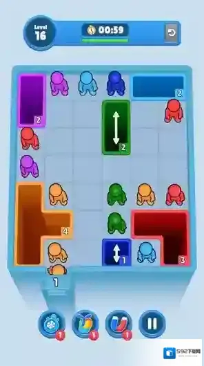 游戏的玩法比较简单,通过移动关卡里的方块让对应颜色的小人进入洞口就可以通关。在关卡里只有对应颜色的小人才可以进入洞口,而且不同颜色的方块和小人是无法穿过去的,移动各种颜色的方块来寻找合适的途径,将所有的小人全部送入洞口来体验最有趣的闯关过程。