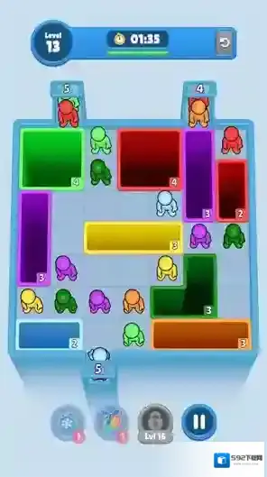 2、每关都会有不同颜色的小人需要进入对应的洞口,每个洞口可以进入的小人数量是有限的。