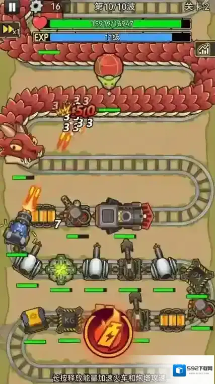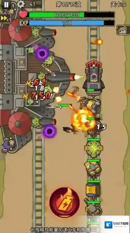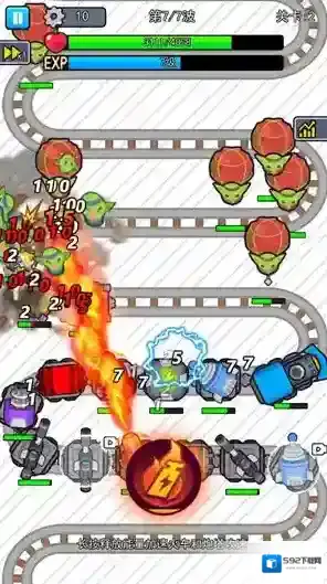 3、放好炮塔后点击开始战斗火车会自动前进,车厢上的炮塔也会自动攻击,点击屏幕中间的按钮可以加速火车和炮塔攻速。