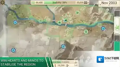 游戏中玩家们将会来到自己选择的区域当中,成为这里临时的治理者,通过建设民生、发展政府项目来发展该区域,获得人民们的支持,提高自己的声望;同时还要去训练军队,建设防御设施,消灭一切妄想占领该区域的反叛军,保持地区的稳定性。游戏的可玩性和策略性十足,体验起来非常的精彩!