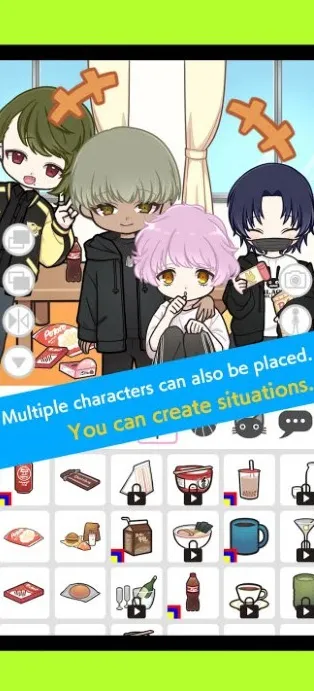 很适合搞oc~很多配件需要看广告领取,20—30秒的广告得看,也可以用商店直接氪金购买。都是QQ人,有单人模板和双人模板,双人模板下,背景,对话框,贴图等等一应俱全,单人模板捏人的话头发稍微图层少了一些,但是配件超级多的!可以拍照,可以上传SNS,有两个保存点,下次来的时候可以编辑上次的。有长头发,可以捏女孩子倒是,衣服也有近似的小裙裙~我很喜欢那个大衣!如果搞oc没有灵感可以试试看,很可爱的。