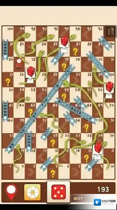 2、在棋盘地图界面,点击投掷骰子图标开始回合,根据骰子点数移动棋子,触发格子上的梯子或小蛇机关。