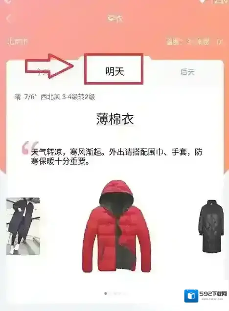 4、点击明天按键 ,显示明日的穿衣推荐。