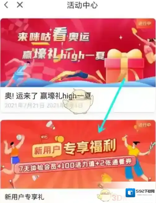1、打开咪咕视频APP,点击右下角我的,再点击登录/注册。 2、注册登录一个新账户。 3、登录后,点击活动中心。 4、点击新用户专享礼。 5、点击立即领取即可。 本文内容来源于互联网,如有侵权请联系删除。2025-08-13 -