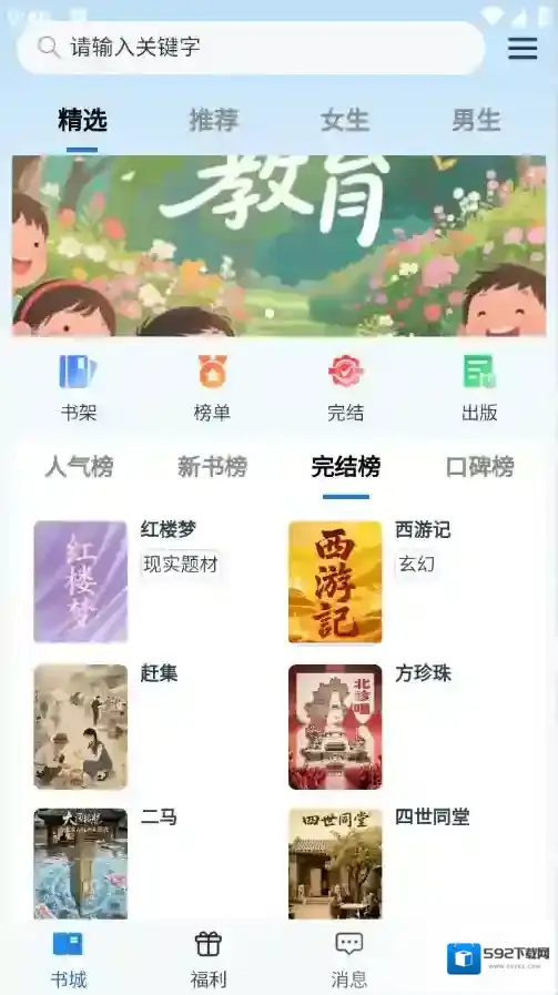 2、书城页面汇集了很多的小说资源,人气榜、新书榜以及完结榜等都有。