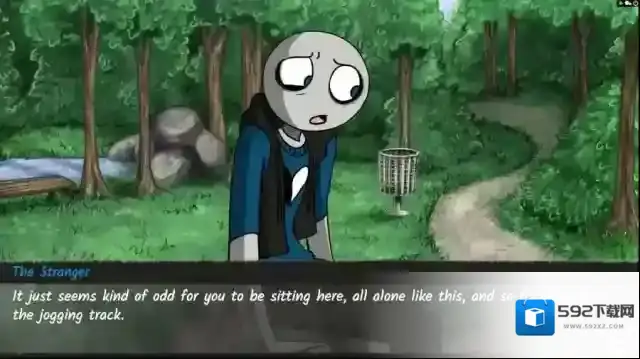 3、呈现了特定场景及对话文本他坐在板凳上盯着我,但我看不懂他的表情,属于剧情推进中的一个情节片段,用于营造故事氛围、推动互动解谜等流程。