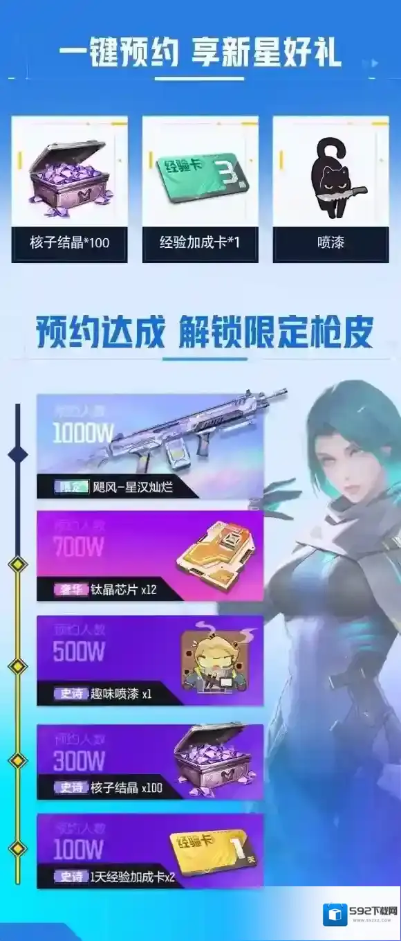 预约即可获得核子结晶、趣味喷漆等游戏奖励,全网预约升级更可解锁游戏内珍贵道具钛金芯片,公测限定枪皮「飓风-星汉灿烂」等游戏奖励。