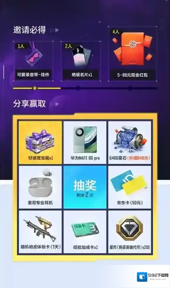 关注官方自媒体、邀请好友预约、分享活动,可获得抽奖次数赢取华为mate 60 pro、索尼专业耳机、6480星石等超值奖励。