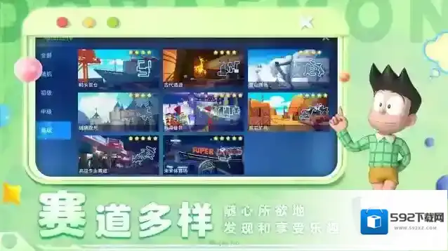 3、兼具奇幻与趣味的赛道,多种地图随意选择。太空旅行、未来都市等奇幻地图,大雄家的后院等经典场景,玩家可驾驶赛车一路狂漂,领略不同的赛道风光。