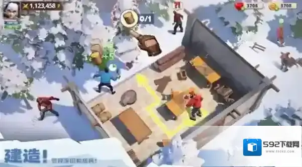 3、切换建造模式,点击红箭头指向资源(木材+5),收集后修复家园,招募居民,提升实力。