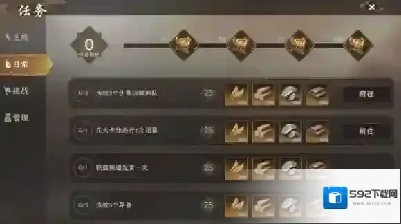 除主线任务外,游戏中还提供了许多日常玩法,点击任务面板左侧的日常任务即可查看当前所有可完成或待领取的每日任务及奖励。