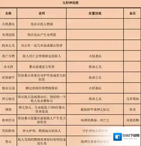 太阳神技能属于光火系。主要针对伤害提升、附属伤害、范围伤害、追踪伤害,是每个大关卡提升实力的关键技能。