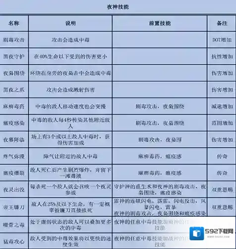 夜神技能具有毒系攻击和溅射伤害的特点。其中,黑夜守护技能是低血量时的保命神技,非常实用。