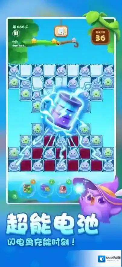 1、三消上面的宝箱,拿道具,用小锤砸左上的闪电鸟;