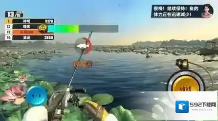 5、钓到鱼后,点击收线按钮,当鱼力竭后,即可成功将其钓起。